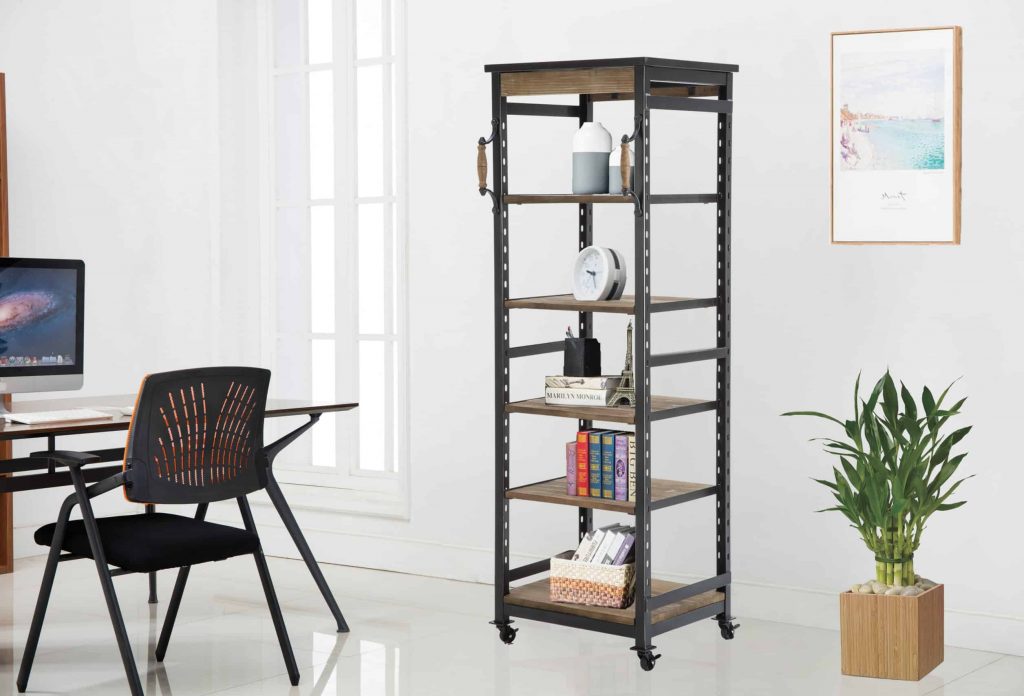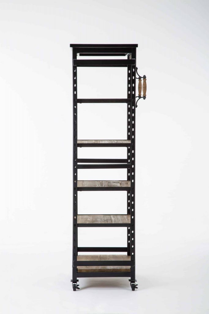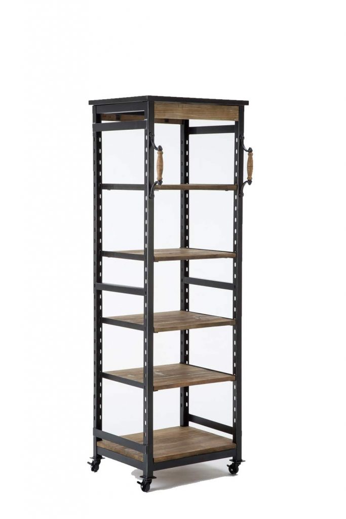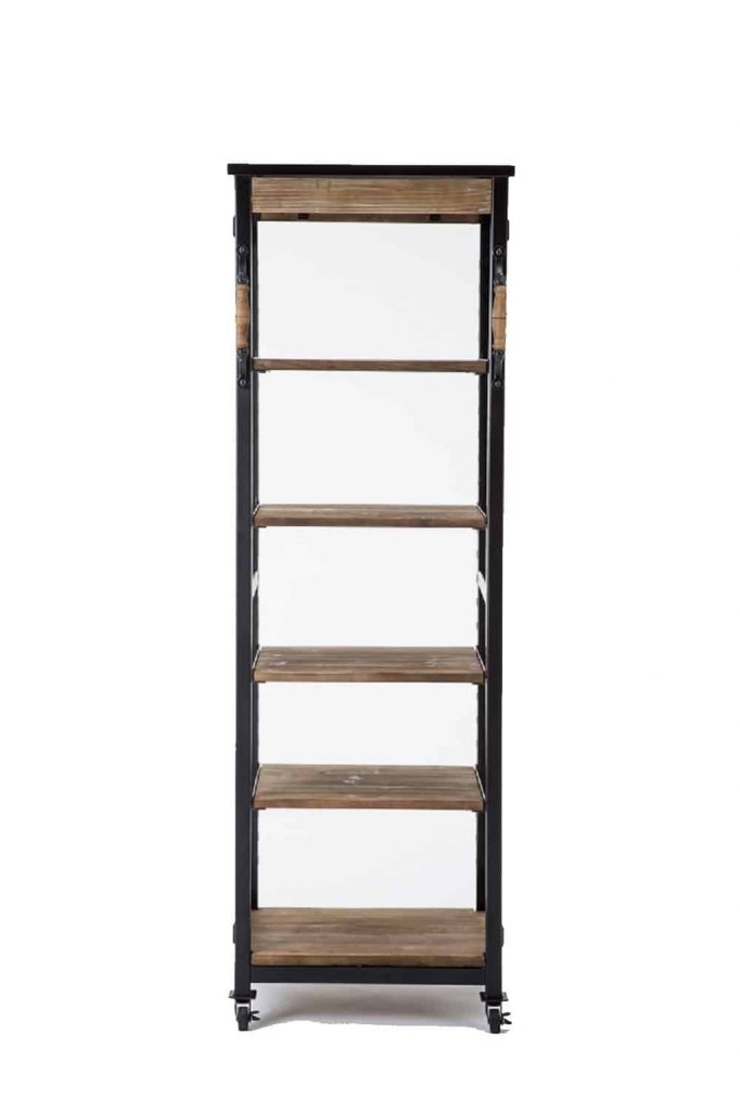 Bring home the best of industrial design with the Hampton Bookshelf II. This bookcase features a metal frame and five reclaimed wood shelves. Four rolling caster wheels give it incredible portability – so you can easily move it around the room, or even from one room to another. Soften up the industrial edge by decorating the shelves with greenery, colorful vases, framed photos, and other cheerful accents. Create a home library and pair this with the original Hampton Bookshelf, sold separately from Burnham Home Designs.