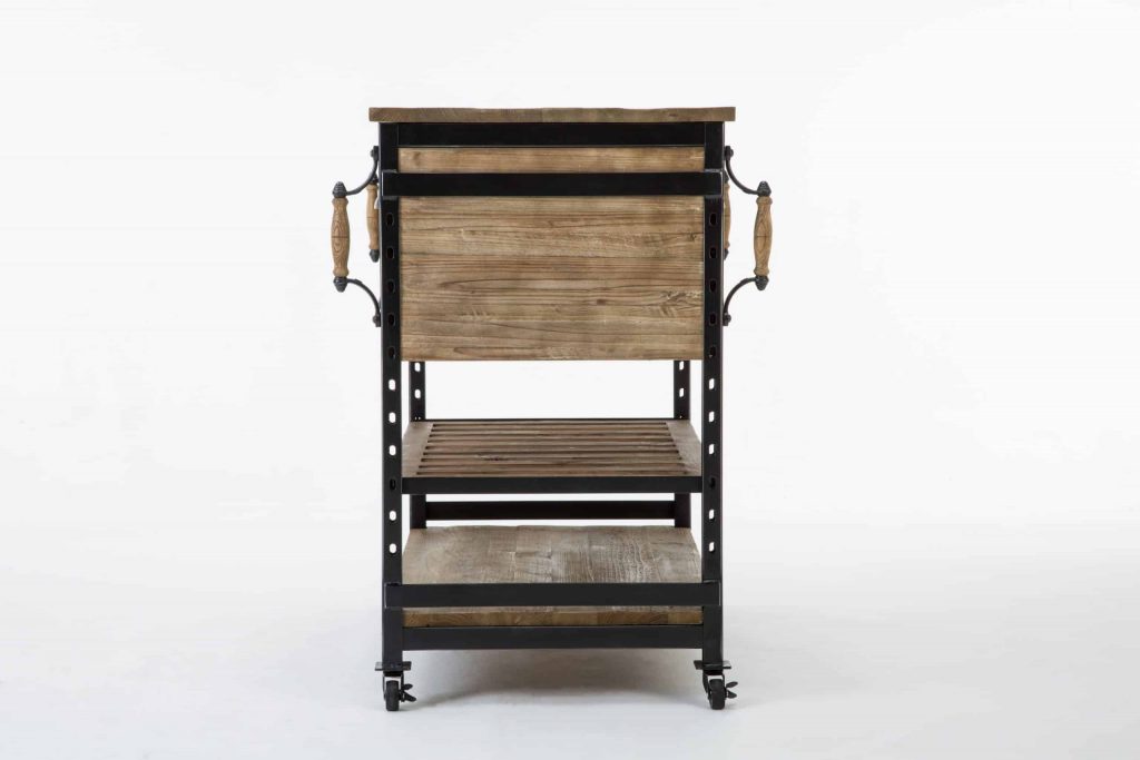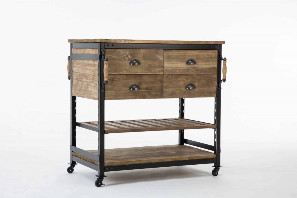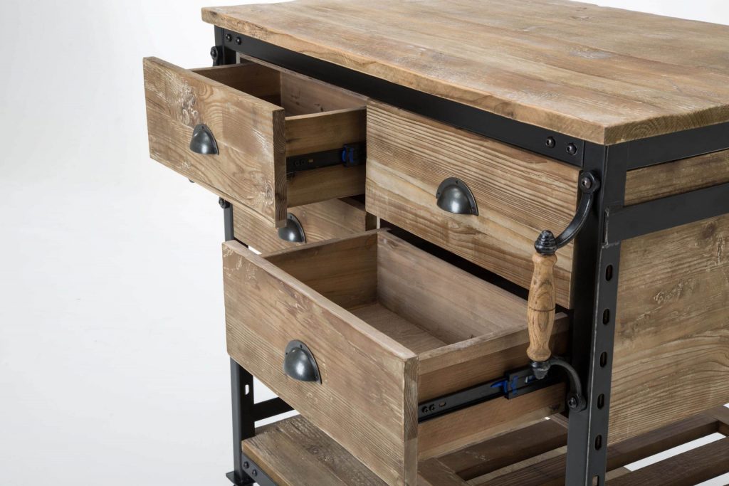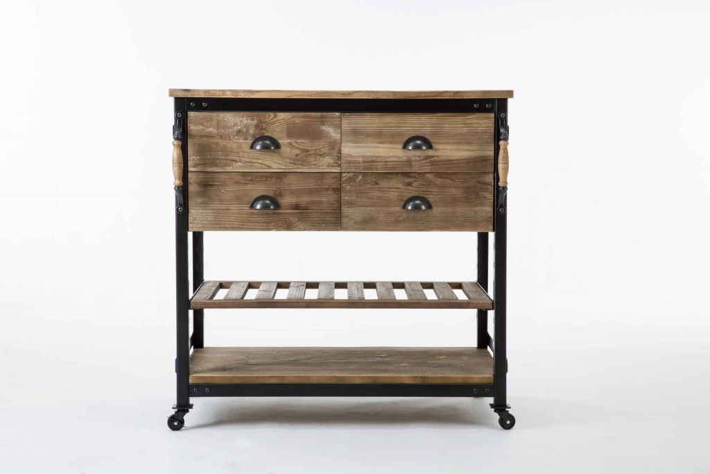 The Hampton Kitchen Island brings your kitchen the extra prep and storage space you’ve been dreaming of. This portable kitchen island has a delightful farmhouse aesthetic, from the reclaimed wood construction to the black metal accents. Four lockable caster wheels allow you to move this cart and then to secure it in place when needed. It even has built-in handles on each corner to offer you complete control when moving. Four drawers store utensils, measuring cups, napkins, spices, and any other kitchen essentials. Use the two lower shelves to stack extra dishes, pots and pans, and glassware within easy reach.