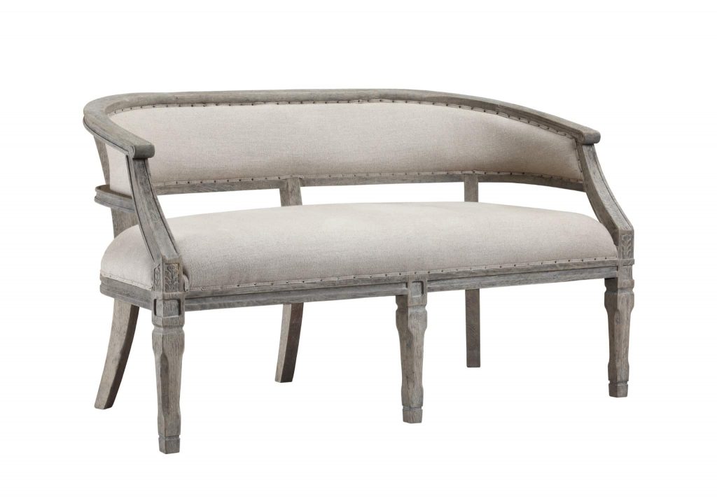 The Julia Loveseat gives your living room a taste of the elegant French countryside. This loveseat features the durability of modern construction with the beauty of vintage-inspired design. It’s crafted with a solid oak frame, flared legs, and carved details. A light gray wash adds antiqued charm to the wood. The lightly padded seat and back are then upholstered in linen and finished off with tiny decorative nailhead trim. Curl up on this comfy double seater with a friend or sprawl out solo with a book.
