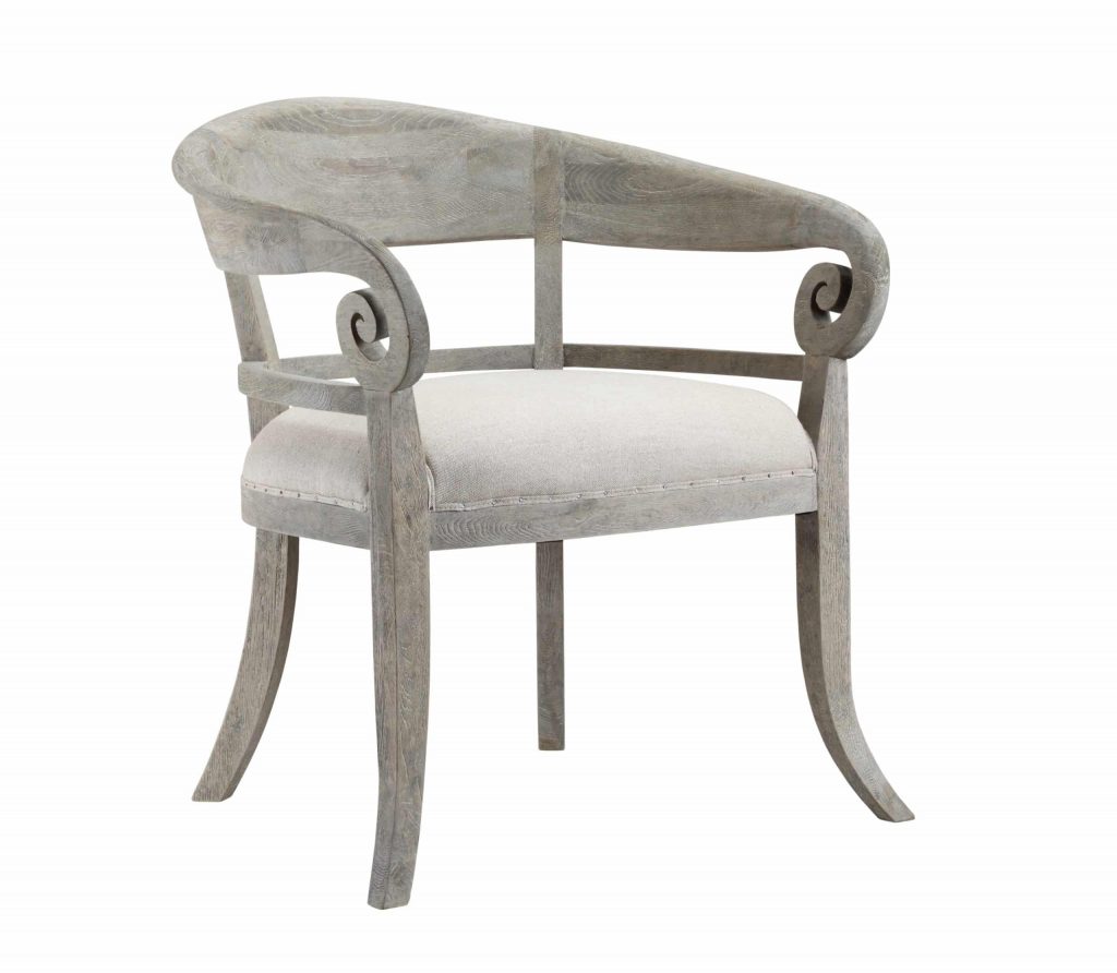 Thanks to the Linda Single Chair, the elegant looks of the French countryside are closer than you think. This sophisticated accent chair looks superb at the head of a dining table, in an office, or sitting pretty in a living room. It’s crafted from solid oak wood, with flared legs and curling armrests grabbing your attention. A natural washed finish brings vintage appeal to the wood. The seat cushion is lightly padded and upholstered with linen, complete with tiny nailhead trim. This elegant accent chair arrives fully assembled.