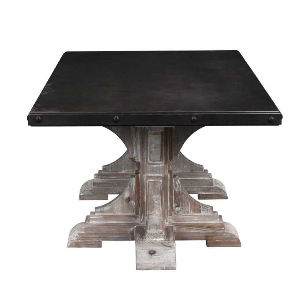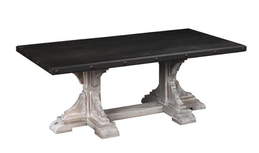 The Novak Coffee Table reimagines traditional design. This elegant coffee table blends sophisticated vintage style with modern mixed materials. Its structural pedestal base is crafted from whitewashed wood, while the tabletop is distressed metal with rivet accents. The result is a new take on a classic. Some assembly is required prior to use: you must attach the table top to the base.