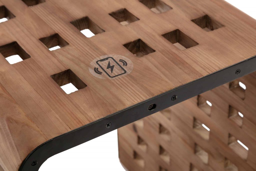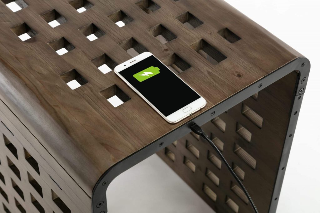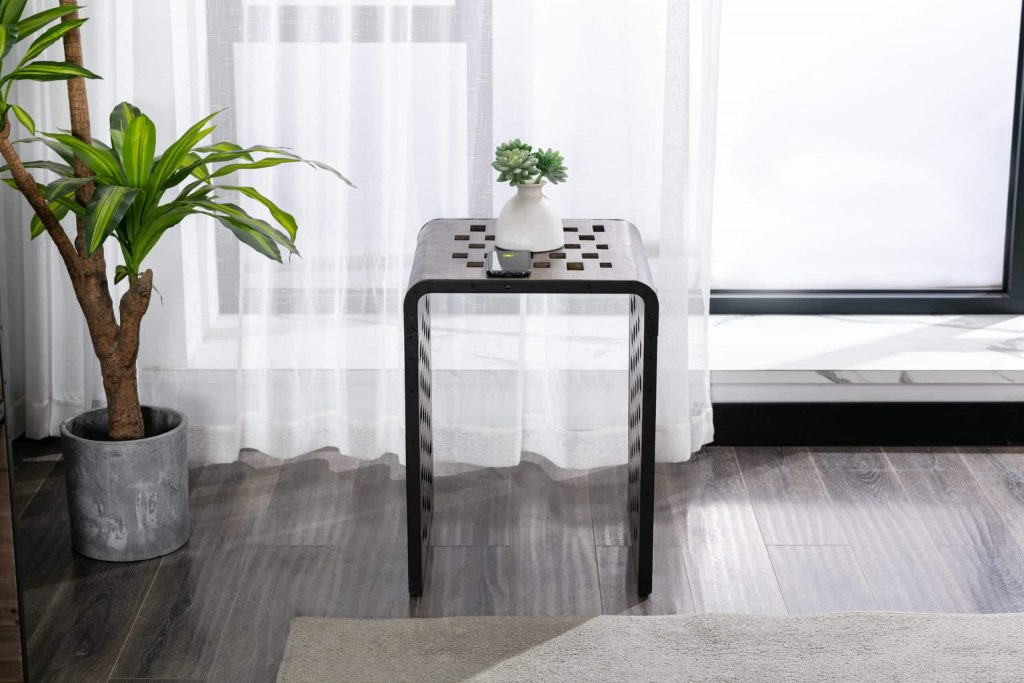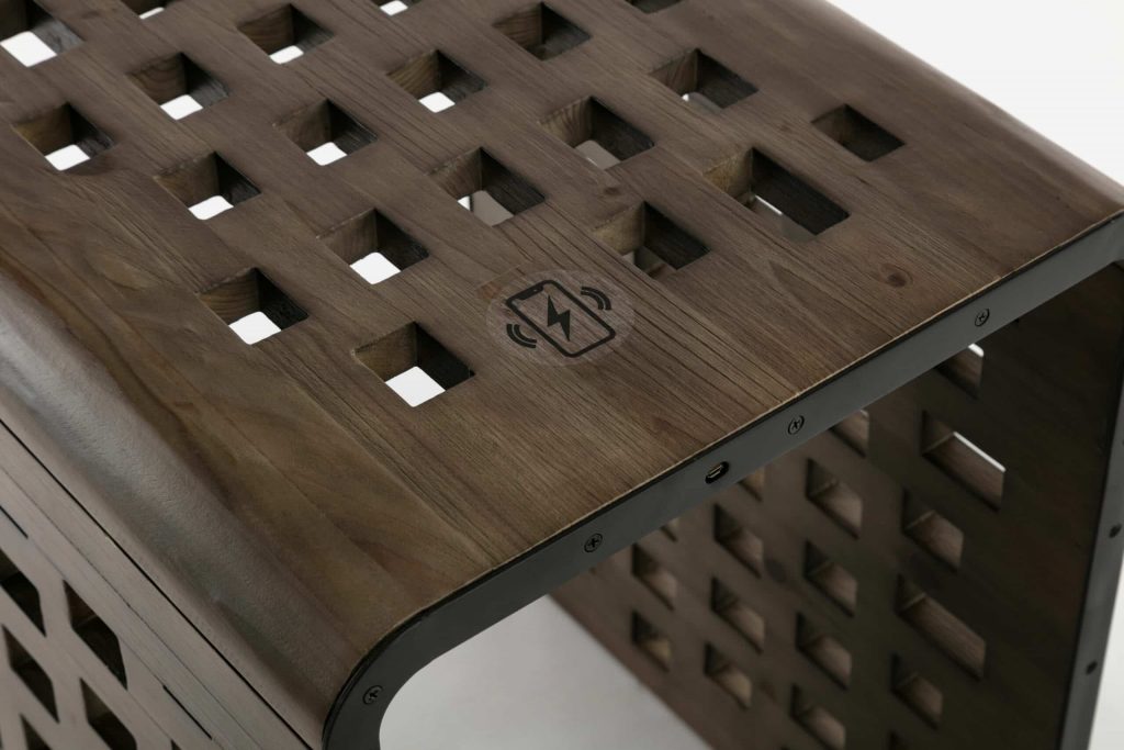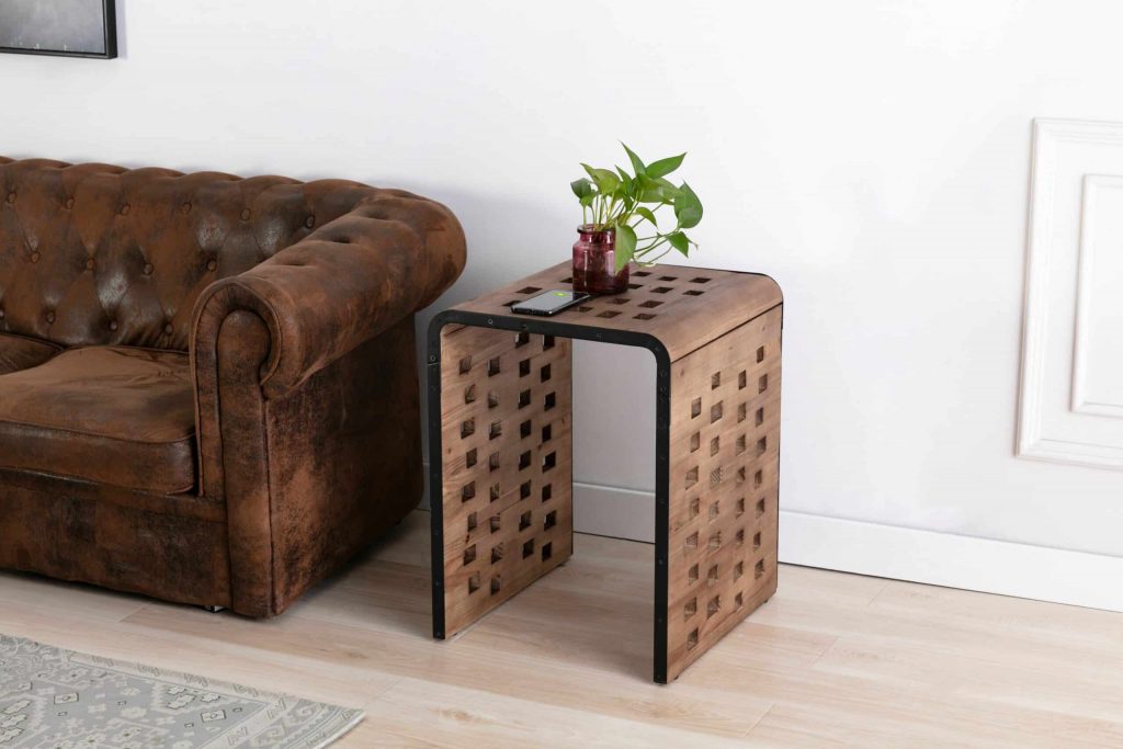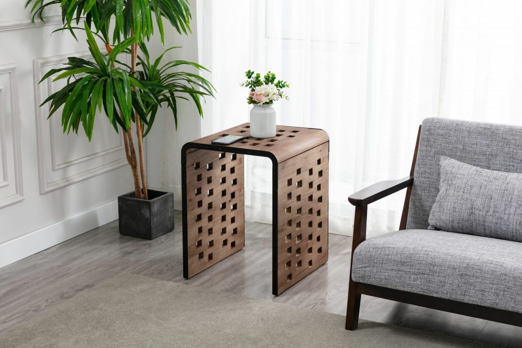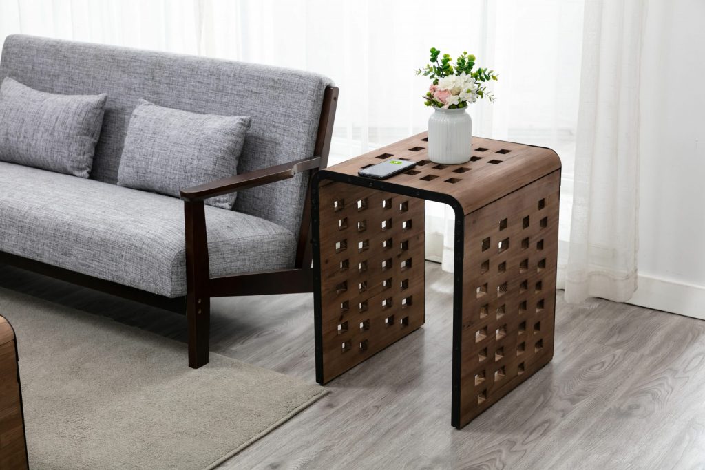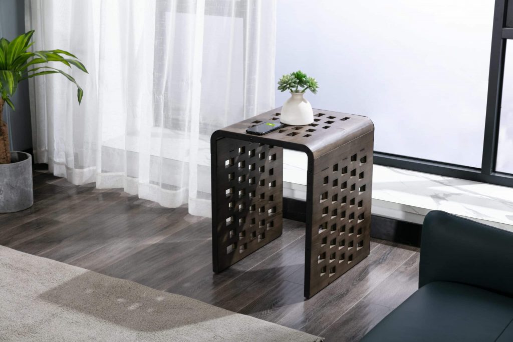 The Parker End Table from Burnham Home Design fits your home like the missing piece to your design puzzle. This unique end table is crafted from old fir wood with an open-slat design all along its surface. The U-shaped table is the perfect place to display lamps and decor. This table has a built in wireless phone charger that works with any Apple or Android phone with wireless charging capabilities. Simply place your phone on top of the charging symbol to charge (Charging symbol is a removable sticker). The Parker End Table is available in two finishes; natural or walnut. Pair it with the matching Parker Coffee Table and Parker Console Table (sold separately) for a living room that gets the guests talking in the best way.