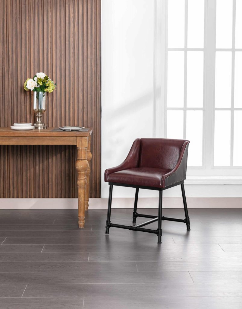 Stylish yet sophisticated, the Parlor Adjustable Upholstered Bar Stool is a must-have addition to any home bar, parlor, or eat-in kitchen. This faux leather bar stool features a foam-padded seat and back with plush faux leather upholstery. The stool’s adjustable seat height ensures it will always be the right height, no matter where you wish to place it, from 18 inches to 29 inches high. Perfect for your dining table, counter or entertainment space. It’s available in three different faux leather options; Desert Red, Midnight Blue, and Burgundy.