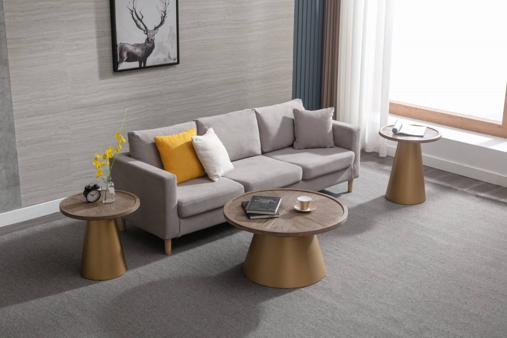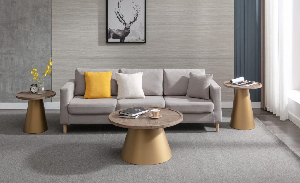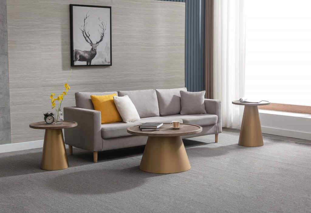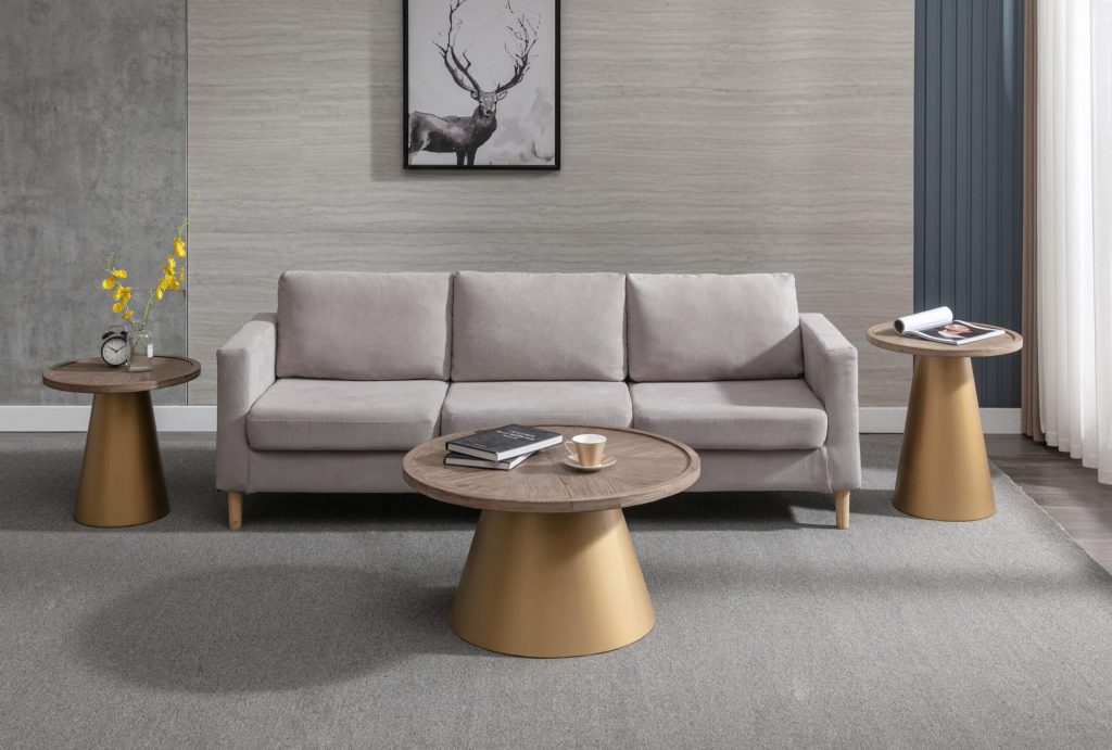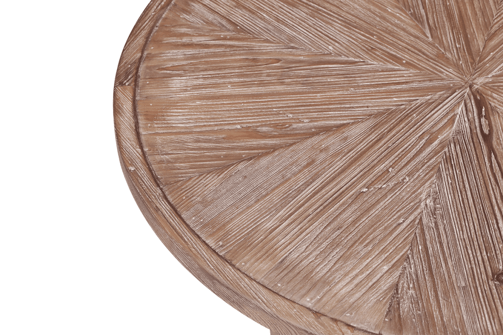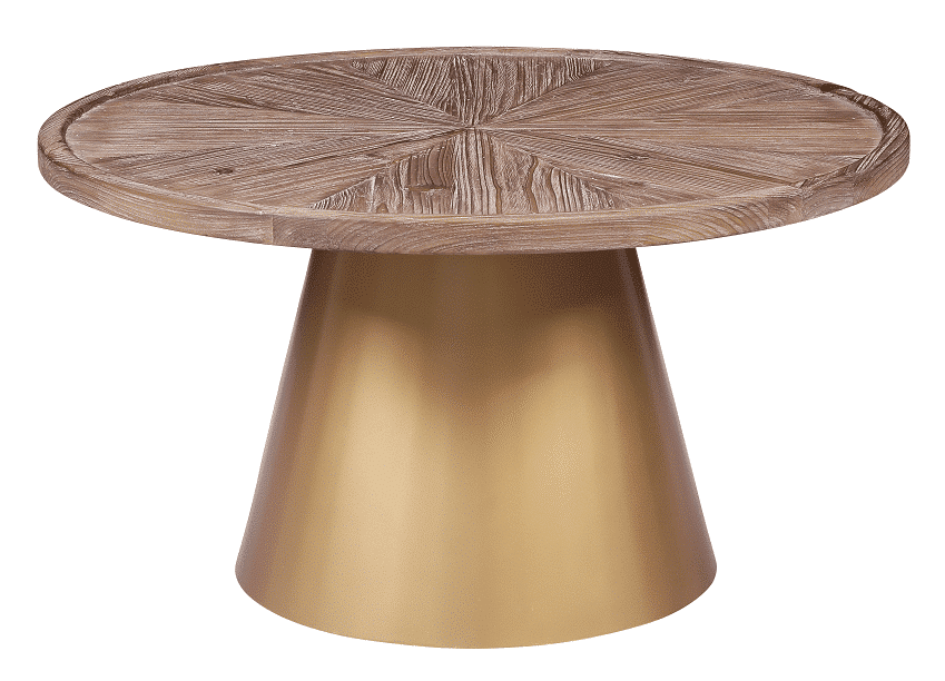 The use of mixed materials and contrasting finishes gives the Patrick Coffee Table a glamorous mid-century modern vibe. The wide conical metal base is finished in a brilliant gold. The simplicity of the base is contrasted by the weathered radial design of the reclaimed pine wood tabletop. For a completely cohesive space, pair this with the matching Patrick Corner Table.