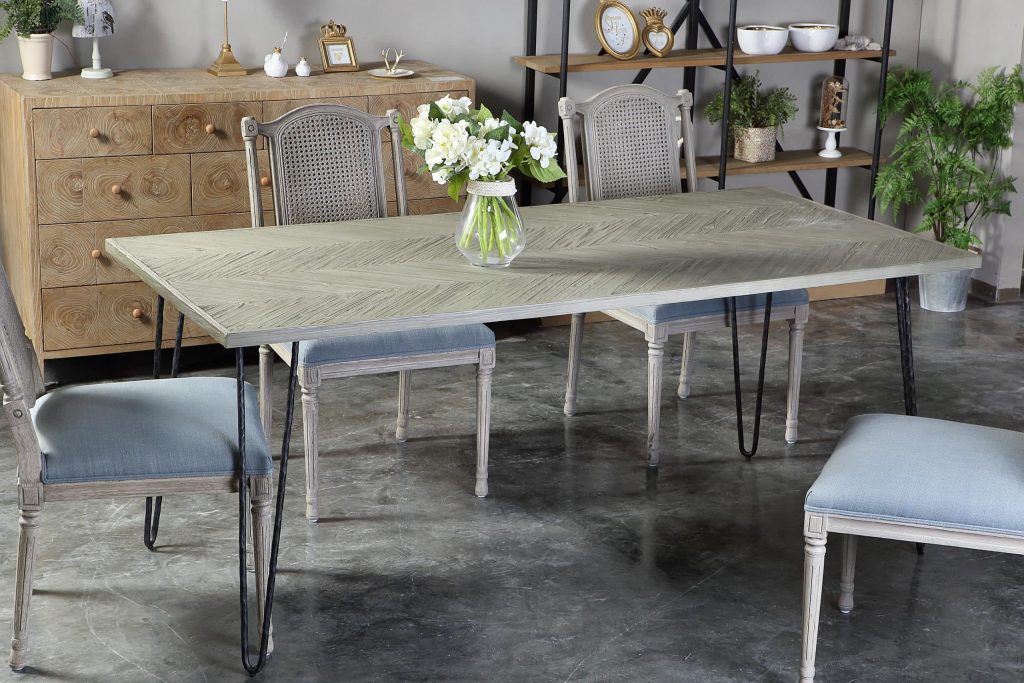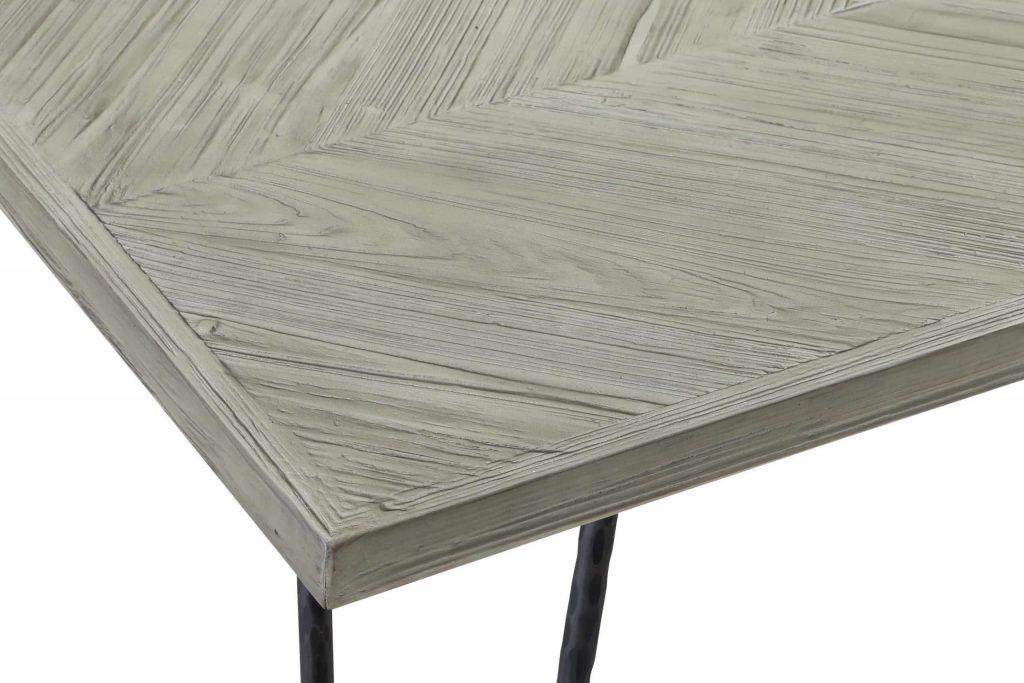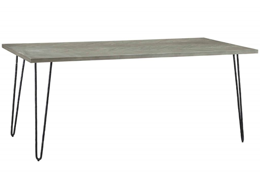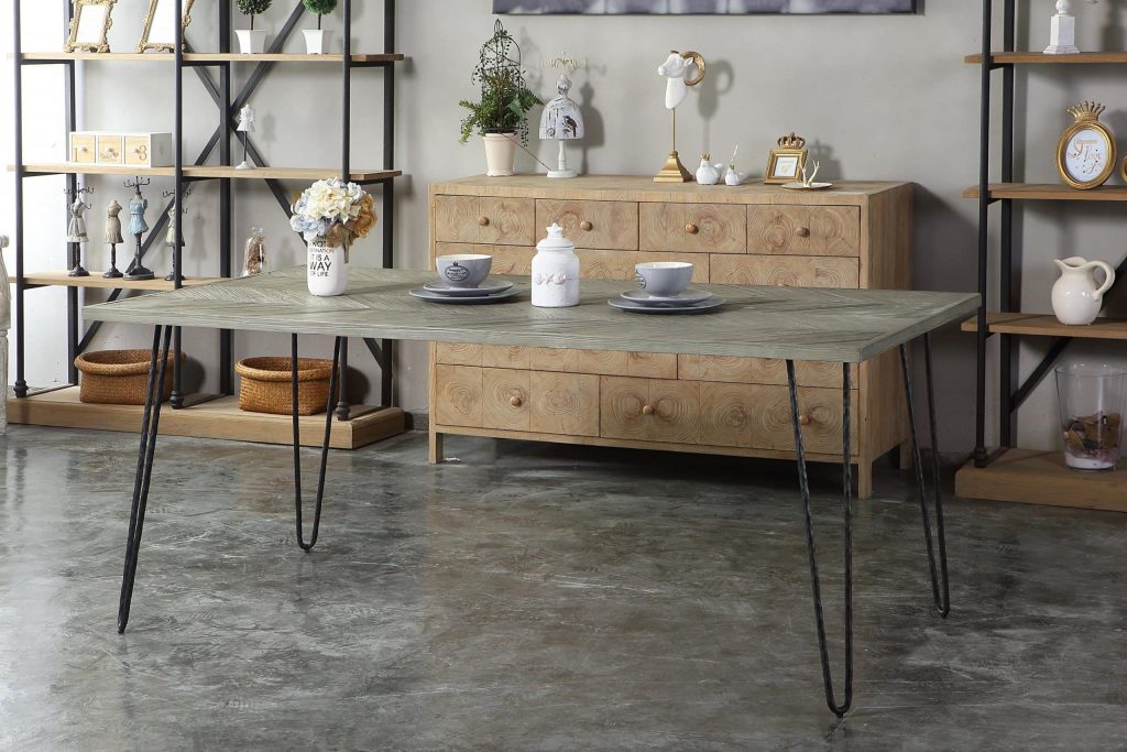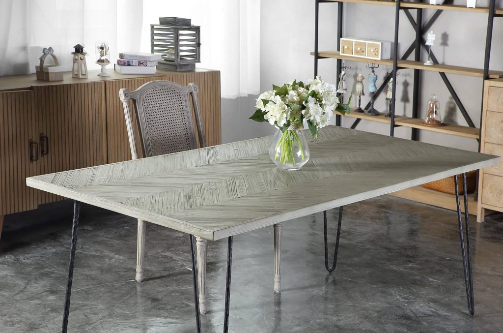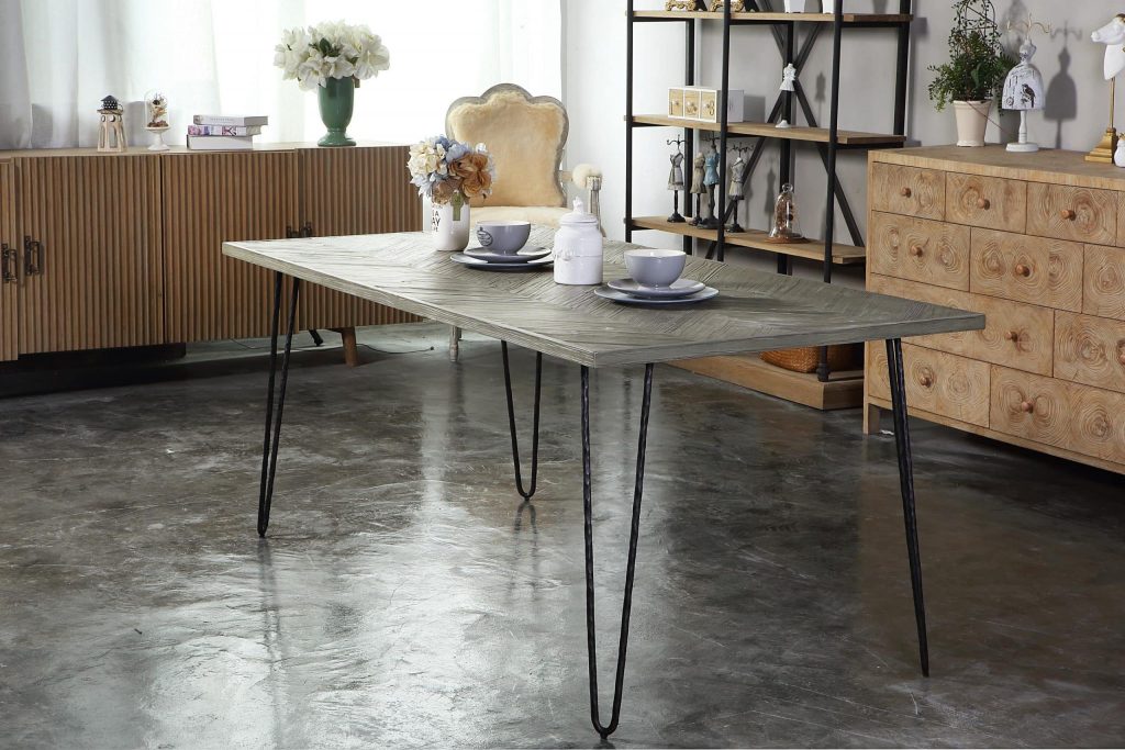 Pin Leg Dining Table is constructed with a reclaimed pine table top and metal legs. It is intended for indoor use only. Ships ready to assemble upon delivery. Comes out of Ningbo, China.