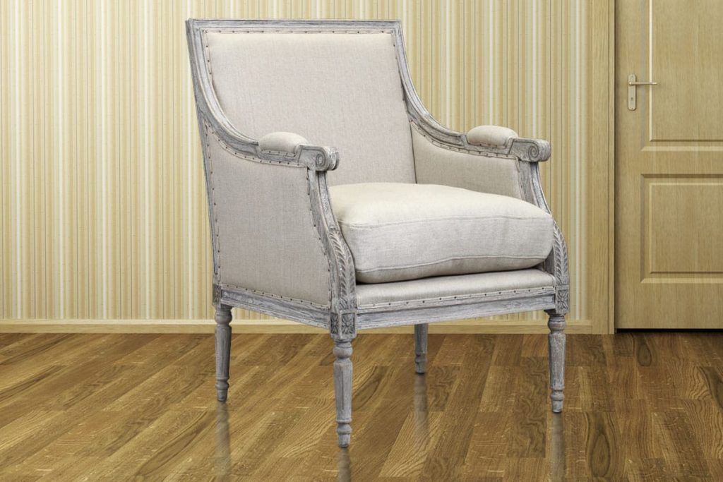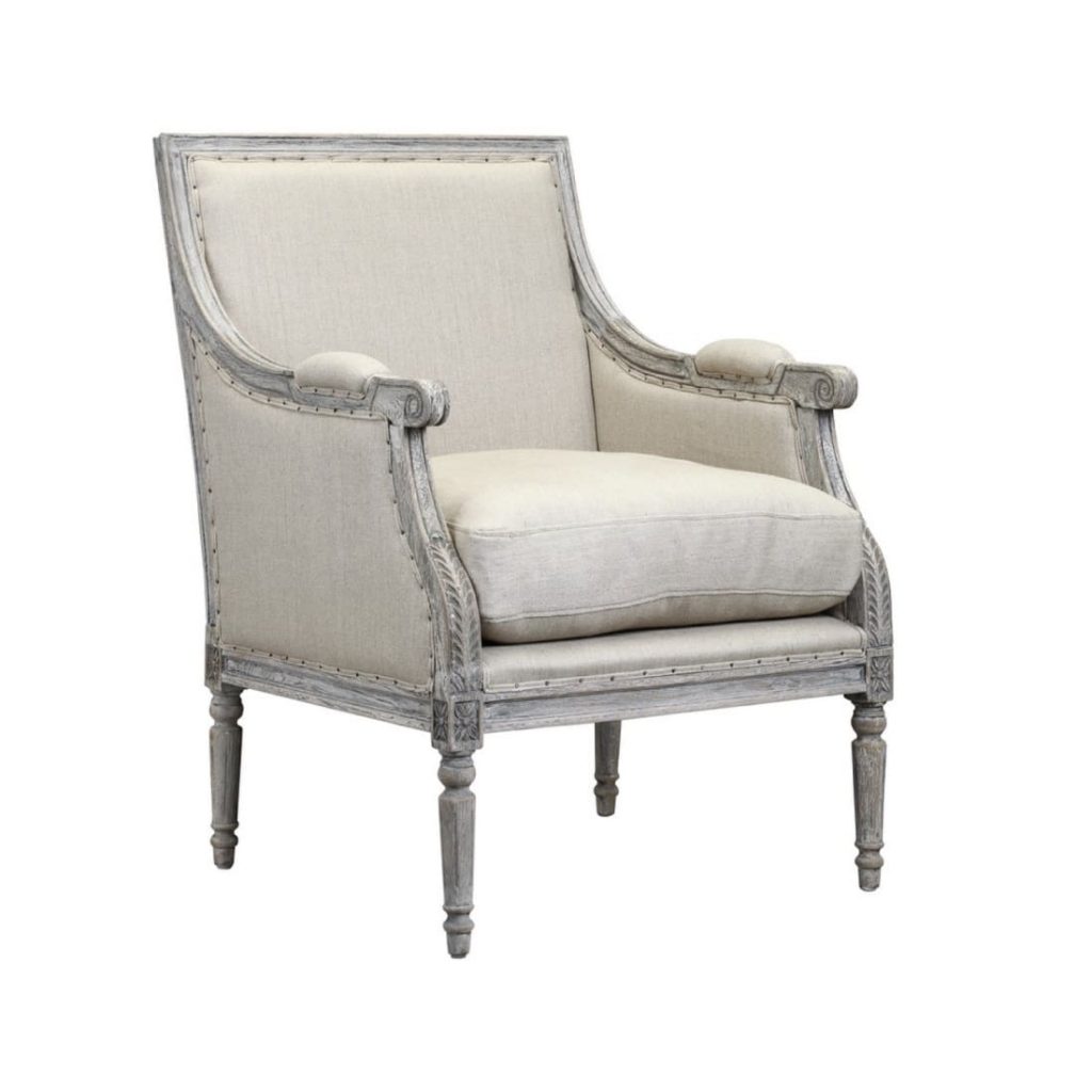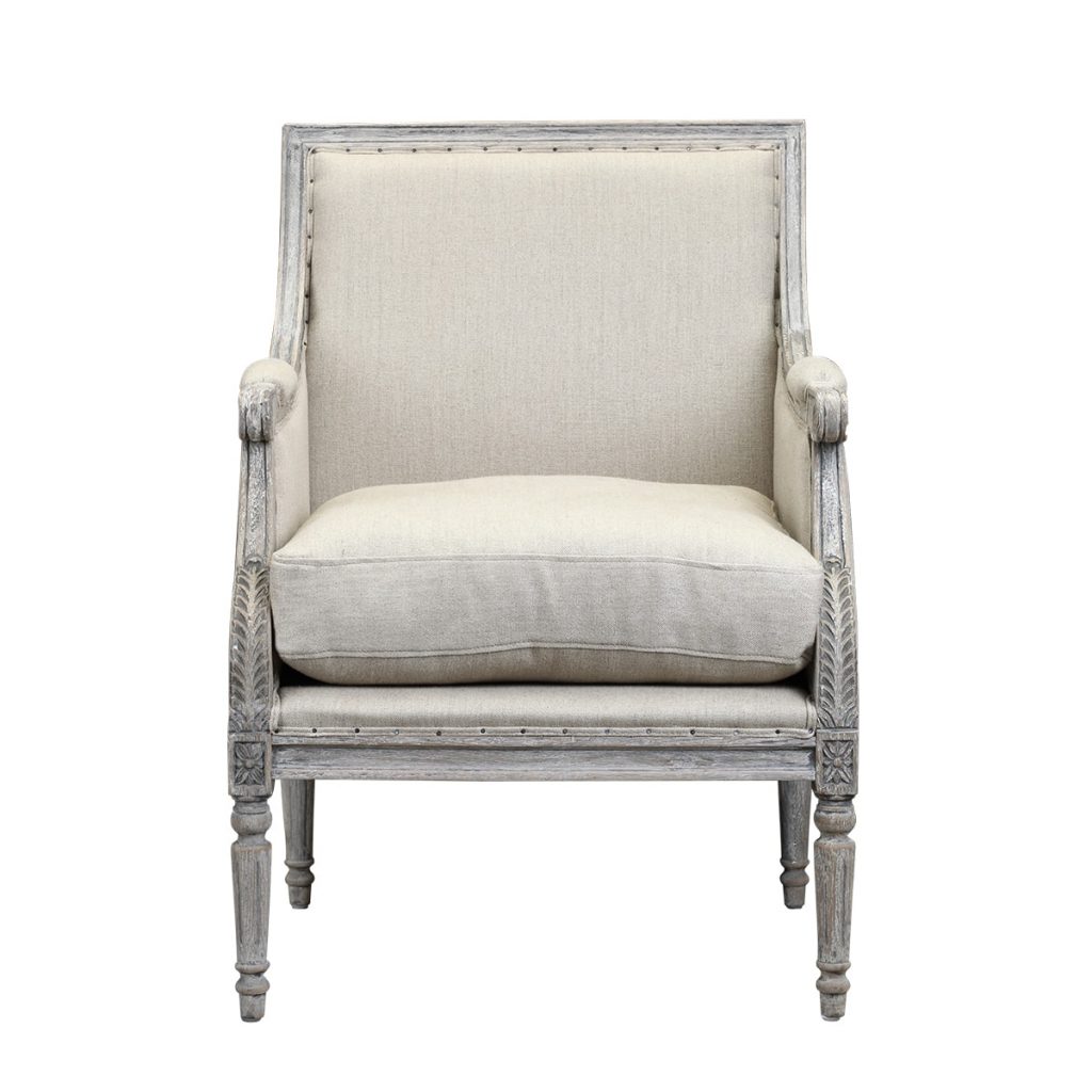 The Prentice Arm Chair is ready to be the star in your living room. This sophisticated antique-style accent chair makes you feel like royalty when you take a seat. The thick removable cushion is padded and then upholstered in neutral linen. Decorative nailhead trim and padded armrests enhance the combination of comfort and looks. The oak wood frame, with its vintage-style finish and hand-carved details, is the piece de resistance.