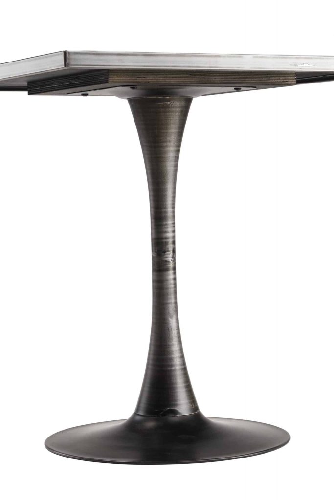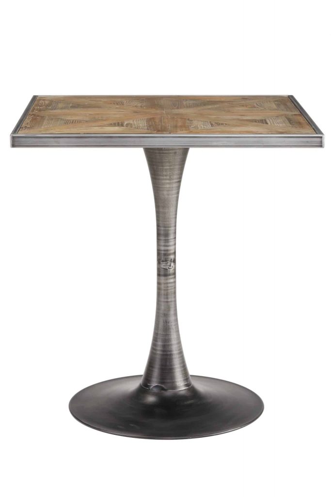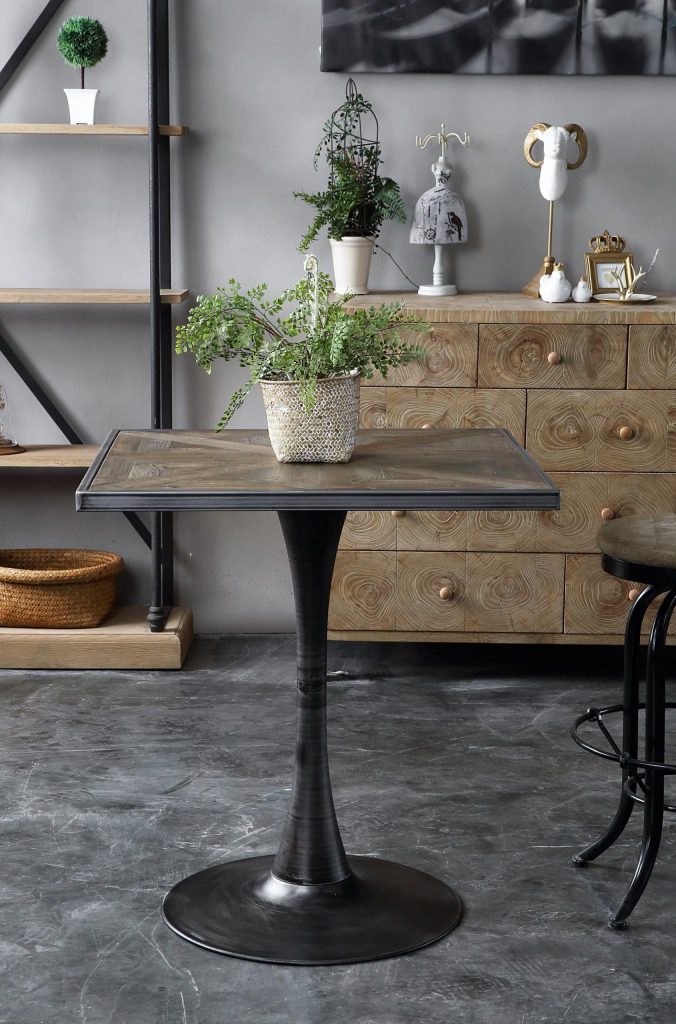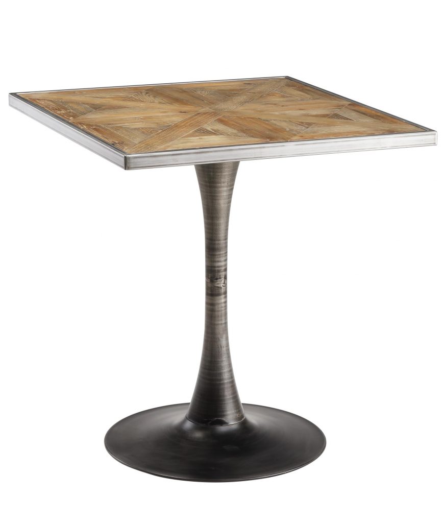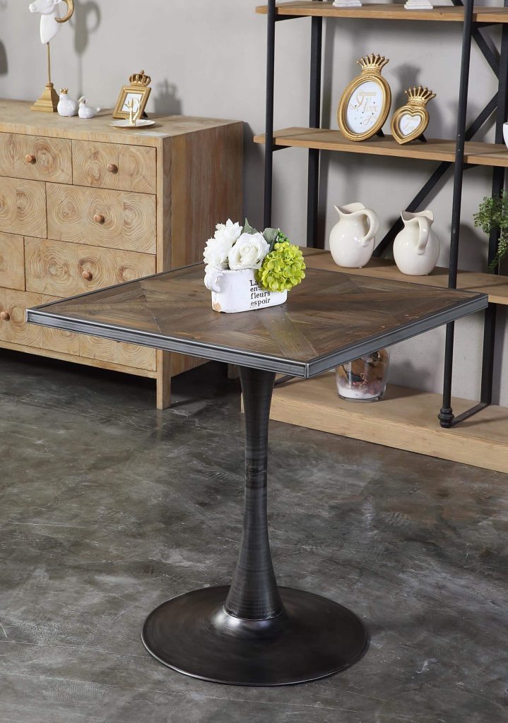 Square dining table made with mixed wood and metal. It is for indoor use only, and is ready to assemble upon delivery. The wood used for the table top is a mix between fir, pine, and elm wood. The base is made with metal. Comes out of Ningbo, China.