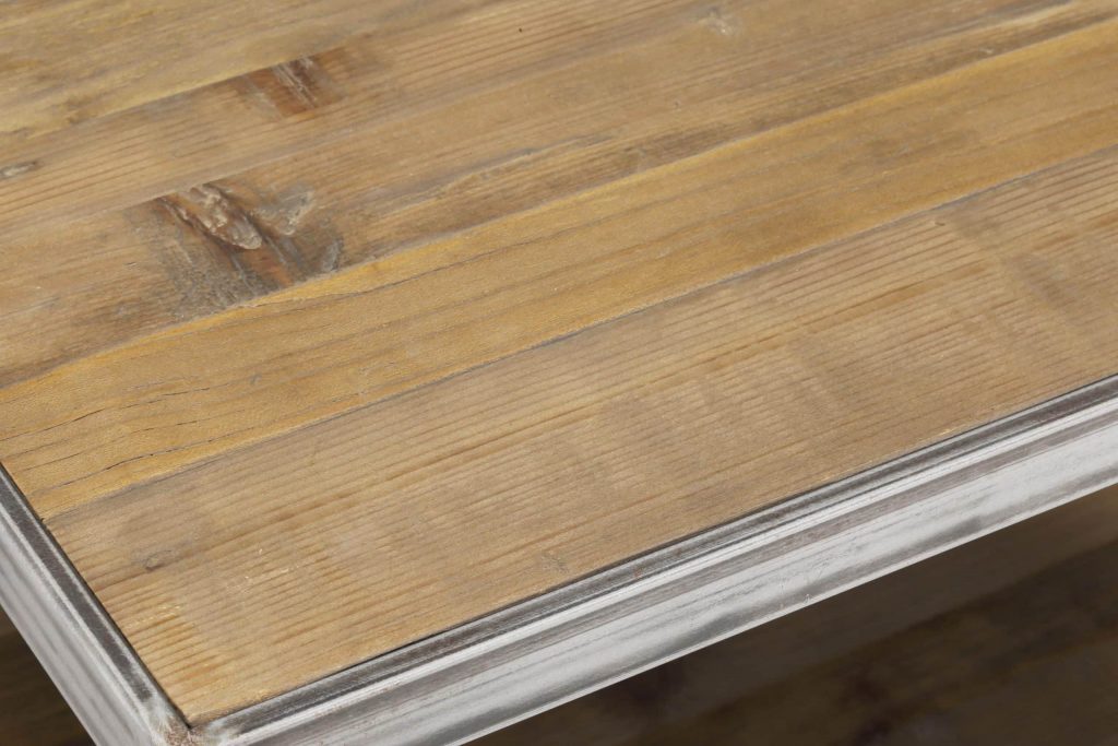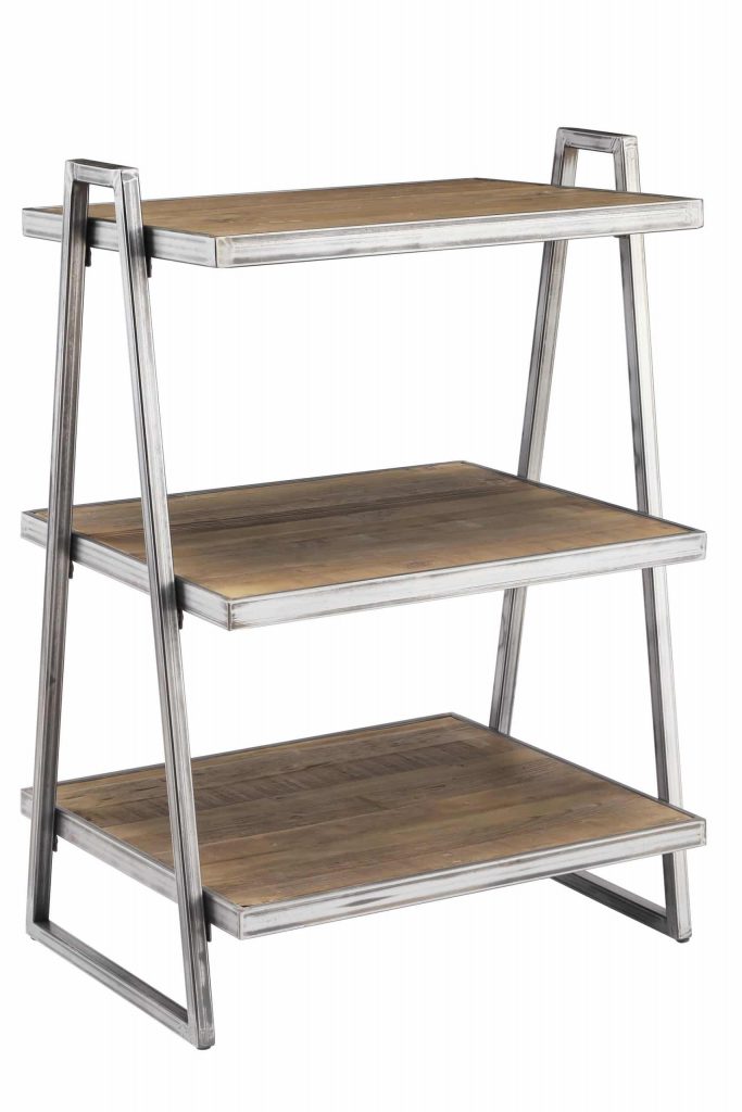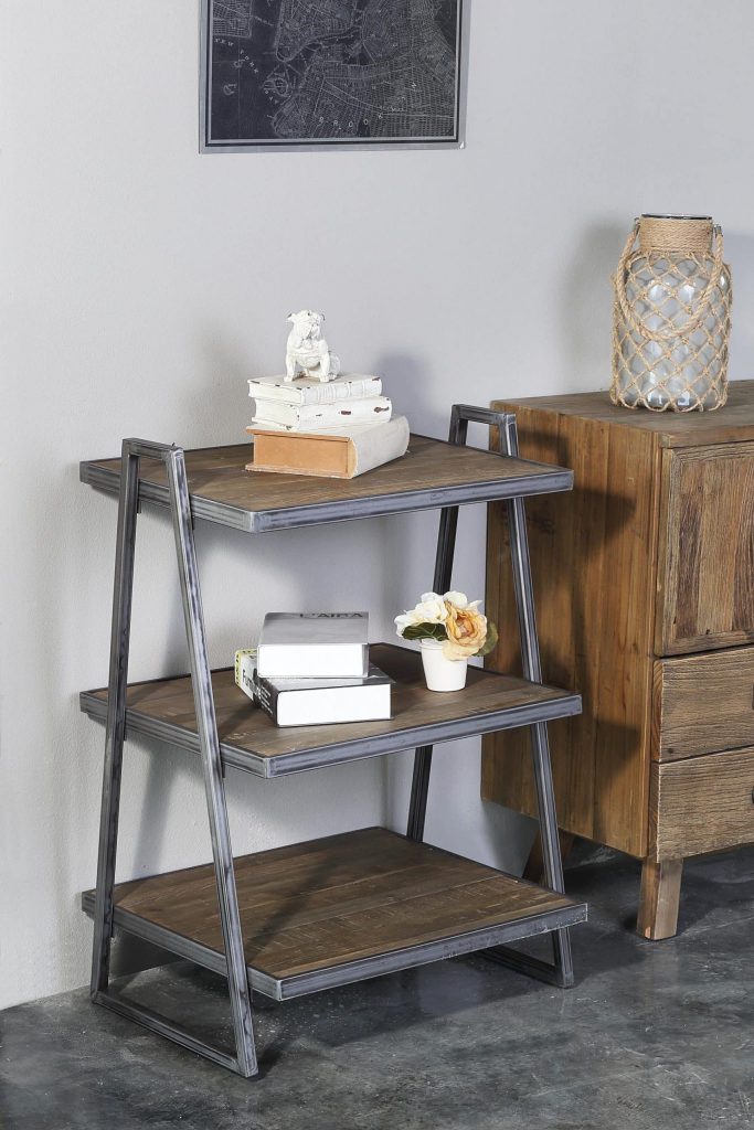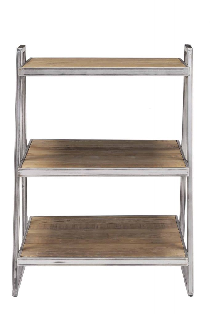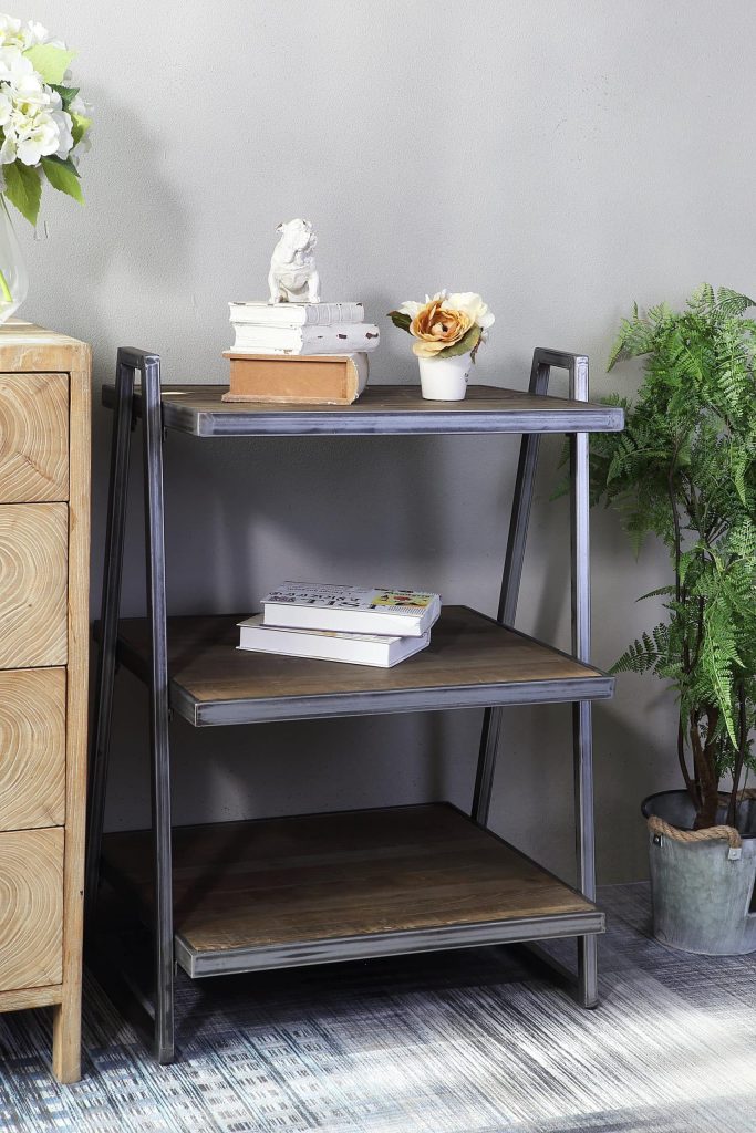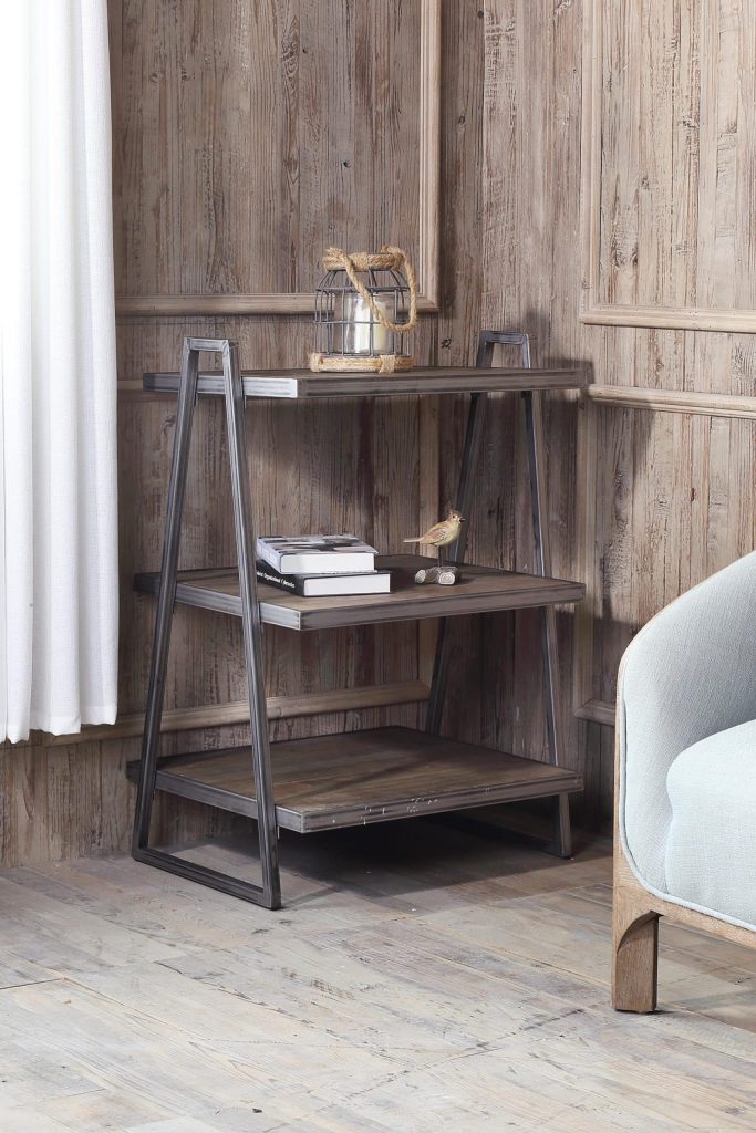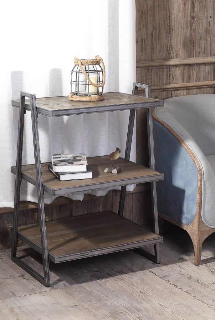 End Table constructed with mixed woods and metal. The woods used is fir, pine, and elm wood. The metal is used on the sides as sled like legs. 3 shelves. Indoor use only. Ready for assembly upon delivery. Comes out of Ningbo, China.