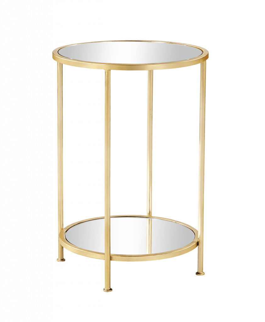 Gold leaf and mirror side table. Comes in only a gold finish. Two shelves for space. Comes fully assembled
